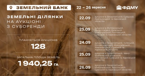 Загалом з 22 по 26 вересня заплановано 128 аукціонів з суборенди державних земельних ділянок сільськогосподарського призначення у межах проєкту Земельний банк. Торги відбудуться в електронній торговій системі Prozorro.Продажі.