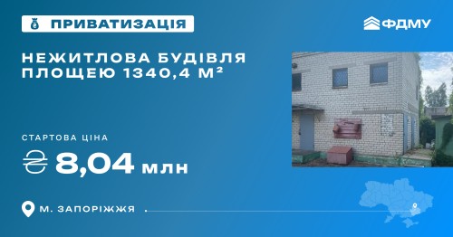 Фонд держмайна оголосив онлайн-аукціон з приватизації нежитлової будівлі загальною площею 1340,4 м² у місті Запоріжжя. Аукціон відбудеться в електронній торговій системі «Прозорро.Продажі»