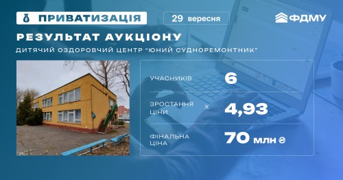 70 млн грн (+ 14 млн грн ПДВ) — результат онлайн-аукціону з приватизації Дитячого оздоровчого центру «Юний судноремонтник» в Одесі