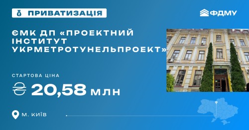 Команда Фонду держмайна оголосила онлайн-аукціон з приватизації єдиного майнового комплексу державного підприємства «Проектний інститут Укрметротунельпроект» в місті Київ. Торги відбудуться в електронній торговій системі «Прозорро.Продажі».