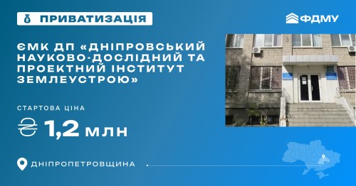 АНОНС: оголошено аукціон з приватизації ЄМК ДП «Дніпровський науково-дослідний та проектний інститут землеустрою»