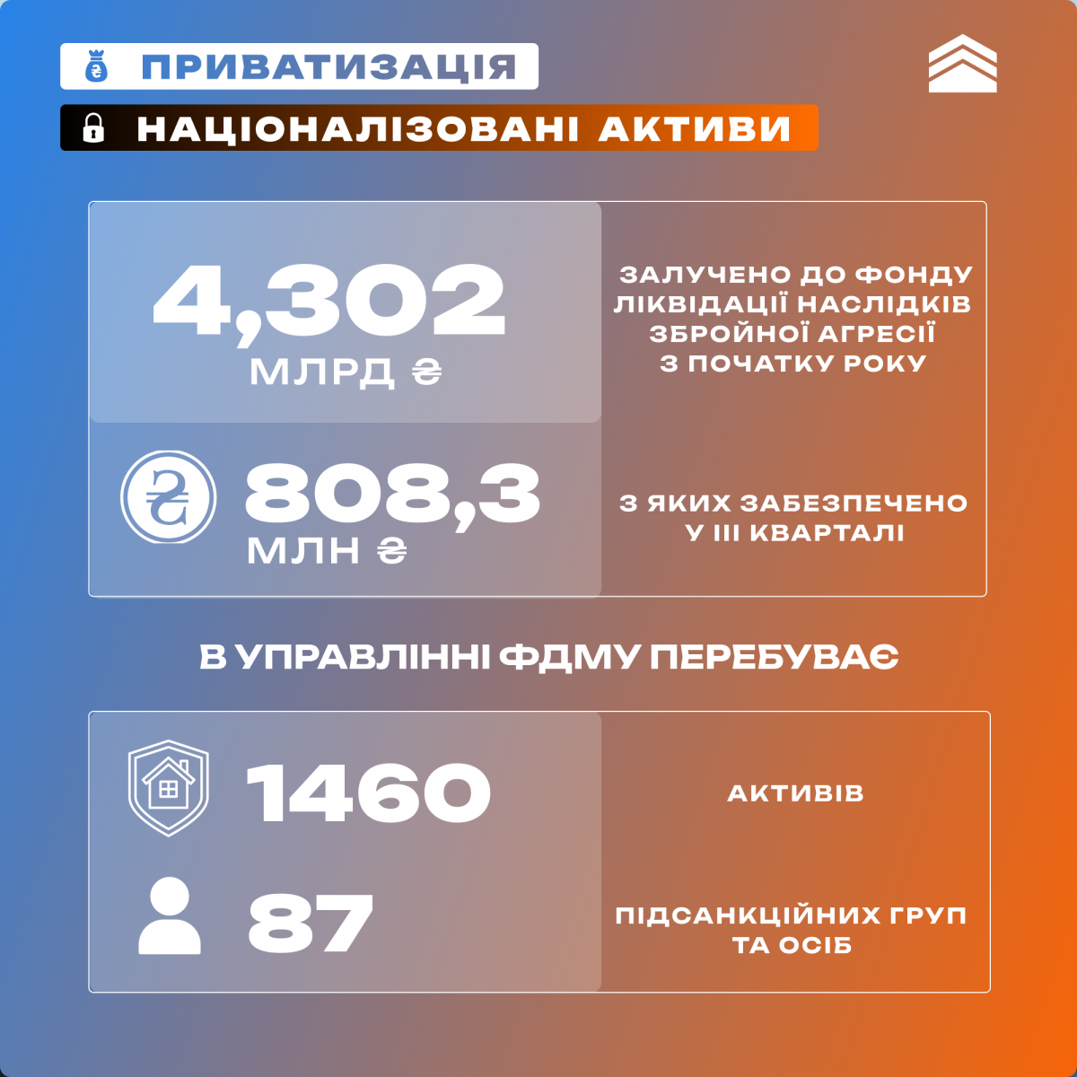Фонд держмайна від початку року залучив до Фонду ліквідації наслідків збройної агресії 4,302 млрд гривень від реалізації націоналізованих (санкційних) активів. З яких 808,30 млн грн надходжень було забезпечено у III кварталі. Це кошти, включно з надходженнями від управління ТРЦ Ocean Plaza (1,8 млрд гривень), приватизації ТОВ "АЕРОК" (1,89 млрд гривень), ПрАТ "Вінницяпобутхім" (608,14 млн. грн), – всі вони були спрямовані на відновлення країни.
