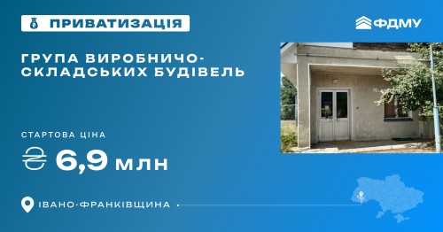 27 жовтня відбудеться онлайн-аукціон з приватизації групи виробничо-складських будівель загальною площею 1 431,5 м² у місті Івано-Франківськ. Завершення прийняття пропозицій — 26 жовтня, 20:00. Торги пройдуть в системі «Прозорро.Продажі».