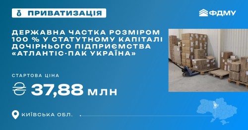 Команда Фонду державного майна України оголосила онлайн-аукціон з приватизації державної частки у розмірі 100 % у статутному капіталі дочірнього підприємства «Атлантіс-Пак Україна». Аукціон пройде в електронній торговій системі «Прозорро.Продажі».