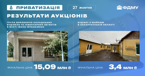 2. Будівлі з майном (понад 221,3 м²) в Закарпатській області. За право власності на об'єкт змагалося 15 учасників, завдяки конкуренції відбулося зростання вартості 385 разів: від стартової – 8,8 тис. грн, до переможної – 3,4 млн грн (+680 тис. грн ПДВ). Тож загальний економічний ефект може становити 4,08 млн грн.