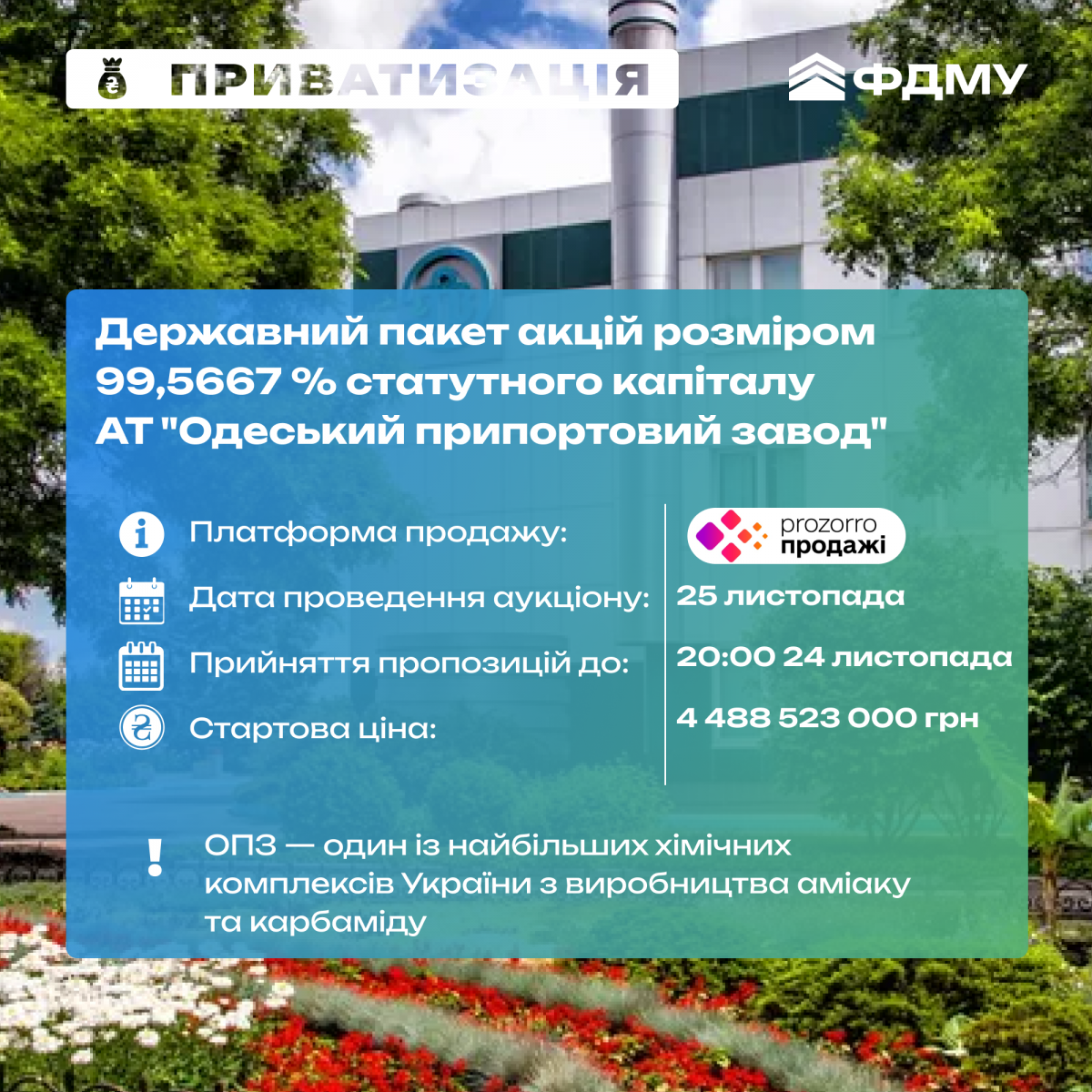 Оголошено аукціон з приватизації державного пакета акцій розміром 99,5667 % статутного капіталу, що становить 795 083 903 штуки акцій АТ "Одеський припортовий завод". Торги пройдуть в електронній торговій системі Прозорро.Продажі.