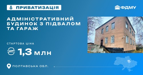 Фонд держмайна виставив на приватизацію адміністративний будинок з підвалом та гараж загальною площею 407,6 м² на Полтавщині. Аукціон відбудеться в електронній торговій системі «Прозорро.Продажі».