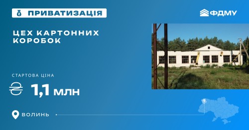 Фонд держмайна оголосив аукціон з приватизації цеху картонних коробок загальною площею 680 м² у Волинській області. Аукціон відбудеться в електронній торговій системі «Прозорро.Продажі».