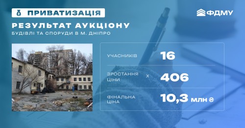 10,3 млн грн (+2,06 млн грн ПДВ) — результат онлайн-аукціону з приватизації будівель та споруд у м. Дніпро.
