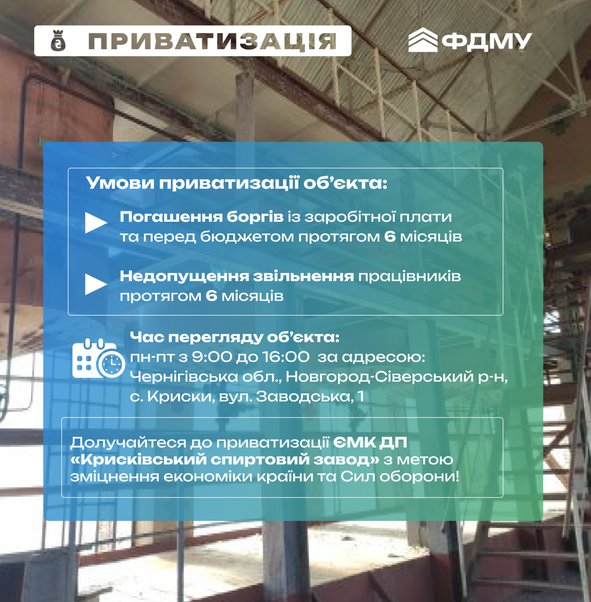 Фонд держмайна оголосив аукціон з приватизації Єдиного майнового комплексу державного підприємства «Крисківський спиртовий завод» на Чернігівщині.