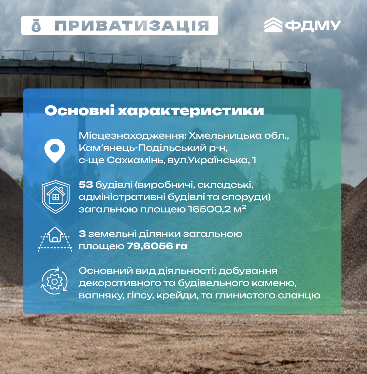 - 53 одиниці нерухомого майна та інфраструктури (виробничі, складські, адміністративні будівлі та споруди тощо) 16500,20 м²,