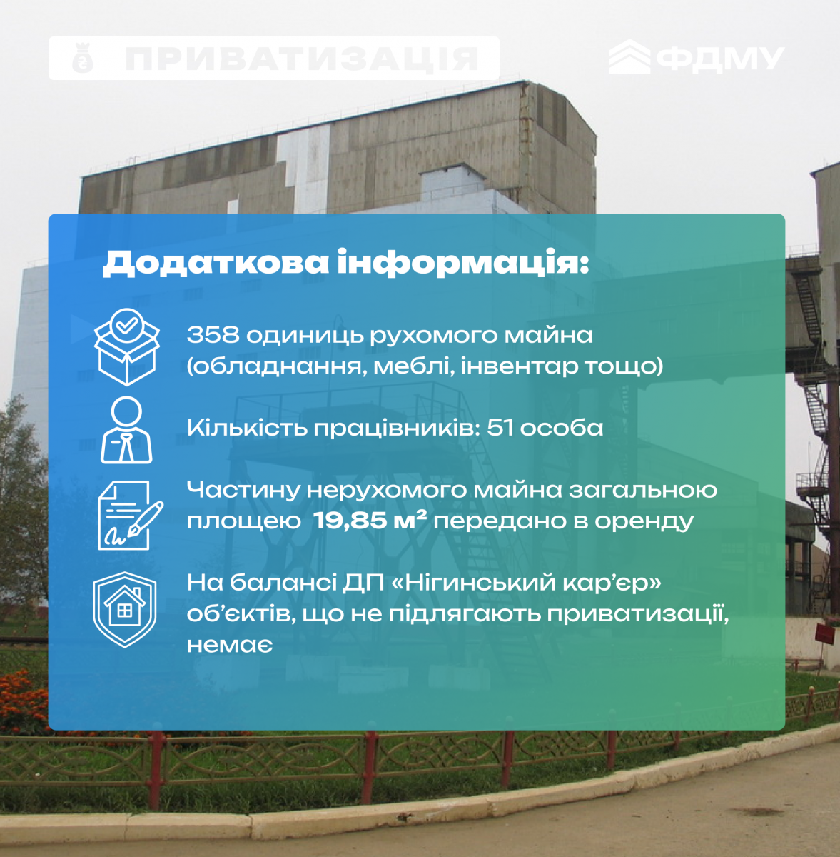 Фонд держмайна виставив на аукціон Єдиний майновий комплекс державного підприємства “Нігинський кар’єр”, що на Хмельниччині. Це діючий майданчик з інфраструктурою – готова база для масштабування видобувного бізнесу! Торги заплановані на електронній платформі Прозоро.Продажі.