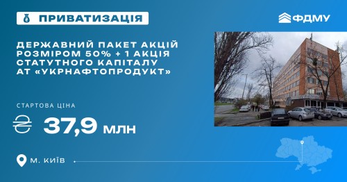 Анонс: державний пакет акцій розміром 50 % + 1 акція статутного капіталу АТ “Укрнафтопродукт” на приватизаційному аукціоні