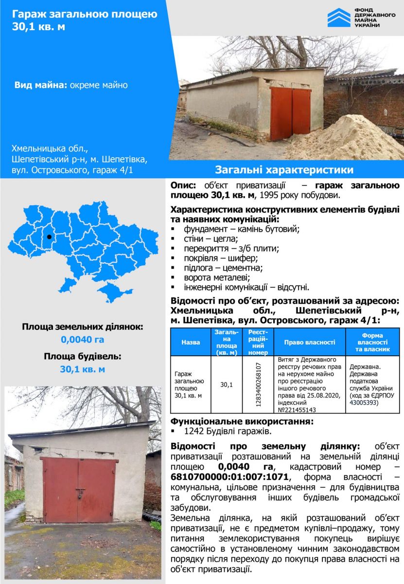 Гараж загальною площею 30,1 м² у місті Шепетівка – у продажу!