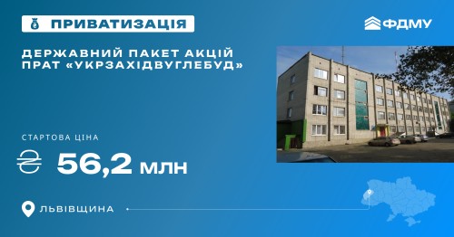Фонд держмайна оголосив аукціон з приватизації державного пакета акцій приватного акціонерного товариства “Укрзахідвуглебуд” в кількості 44637304 штук акцій, що становить 99,6667 % статутного капіталу товариства. Аукціон пройде в електронній торговій системі «Прозорро.Продажі».