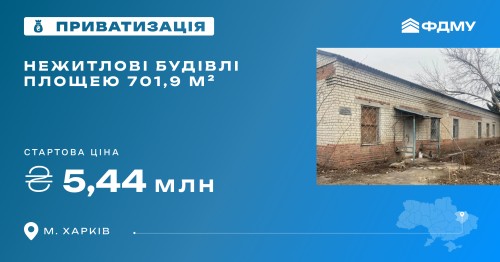 23 липня в електронній торговій системі «Прозорро.Продажі» очікується проведення онлайн-аукціону з приватизації нежитлової будівлі загальною площею 701,9 м² у місті Харків. Завершення прийняття пропозицій для участі — 22 липня, 20:00.