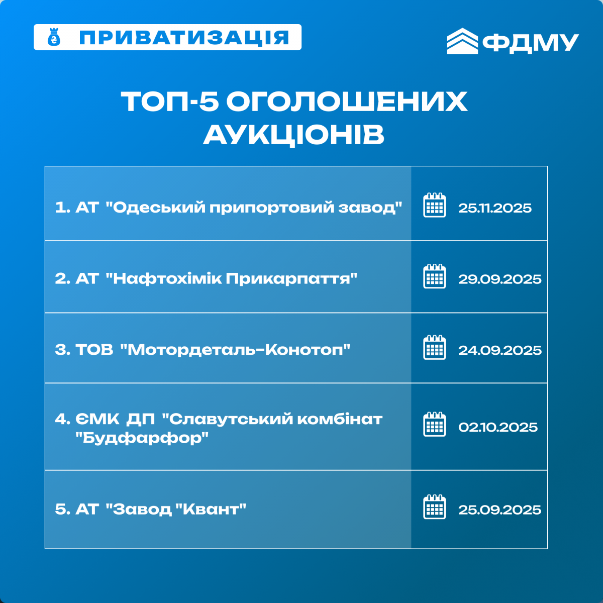 29.09.2025 – Приватизація АТ "Нафтохімік Прикарпаття" (26%) на Івано-Франківщині