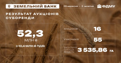 52,3 млн гривень (+ 10,4 млн грн ПДВ) – результати торгів «Земельного банку» цього тижня