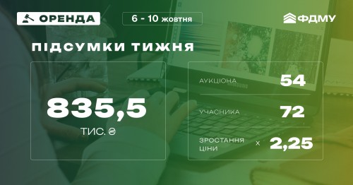 Команда Фонду держмайна минулого тижня провела 62 аукціони з оренди державного майна, з них відбулося 54 на суму – 835 548 гривень.