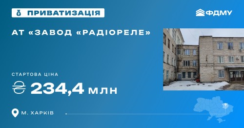 28 жовтня заплановане проведення онлайн-аукціону з приватизації державного пакета акцій розміром 100,00 % статутного капіталу АТ «Завод «Радіореле» в місті Харків. Реєстрація на участь в аукціоні триває до 27 жовтня 20:00.