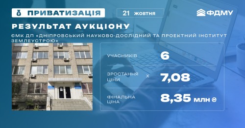 8,35 млн (+ 1,67 млн грн ПДВ) – результат аукціону з приватизації ЄМК ДП «Дніпровський науково-дослідний та проектний інститут землеустрою»