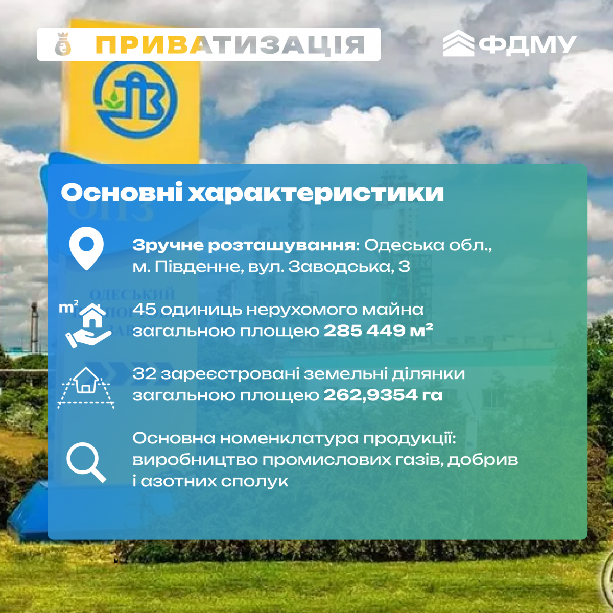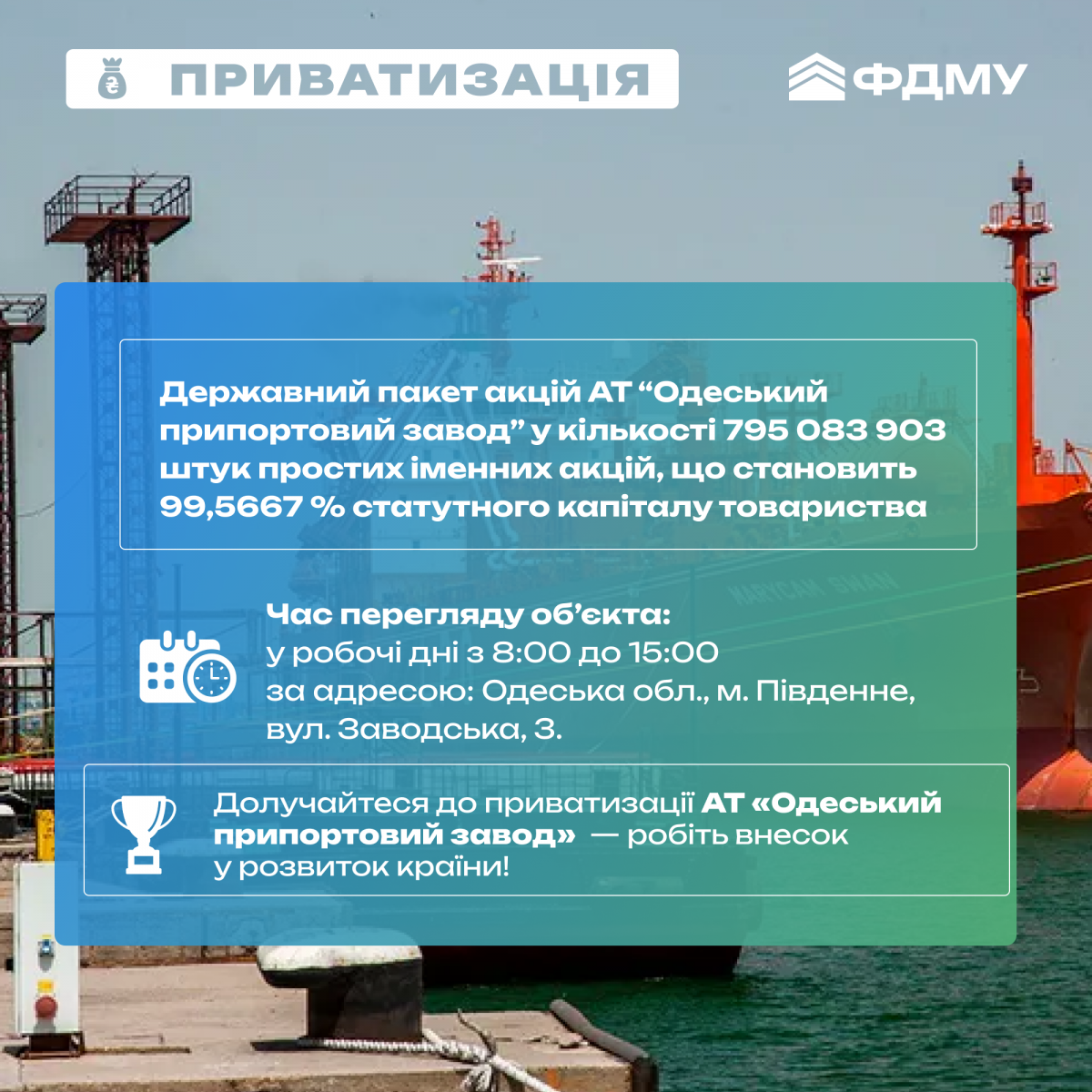 Оголошено аукціон з приватизації державного пакета акцій розміром 99,5667 % статутного капіталу, що становить 795 083 903 штуки акцій АТ "Одеський припортовий завод". Торги пройдуть в електронній торговій системі Прозорро.Продажі.