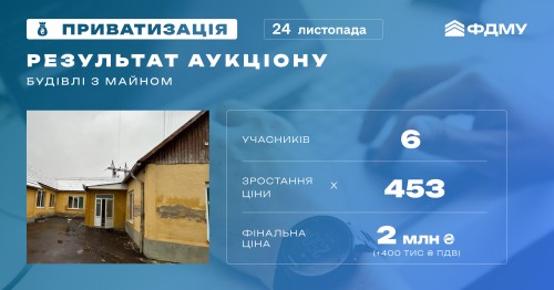 2 млн грн (+400 тис грн ПДВ) — результат онлайн-аукціону з приватизації будівель з майном у Закарпатській області.