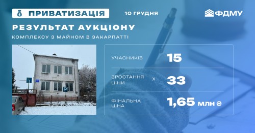 1,65 млн грн (+ 330 тис. грн ПДВ) – результат аукціону з приватизації комплексу з майном на Закарпатті