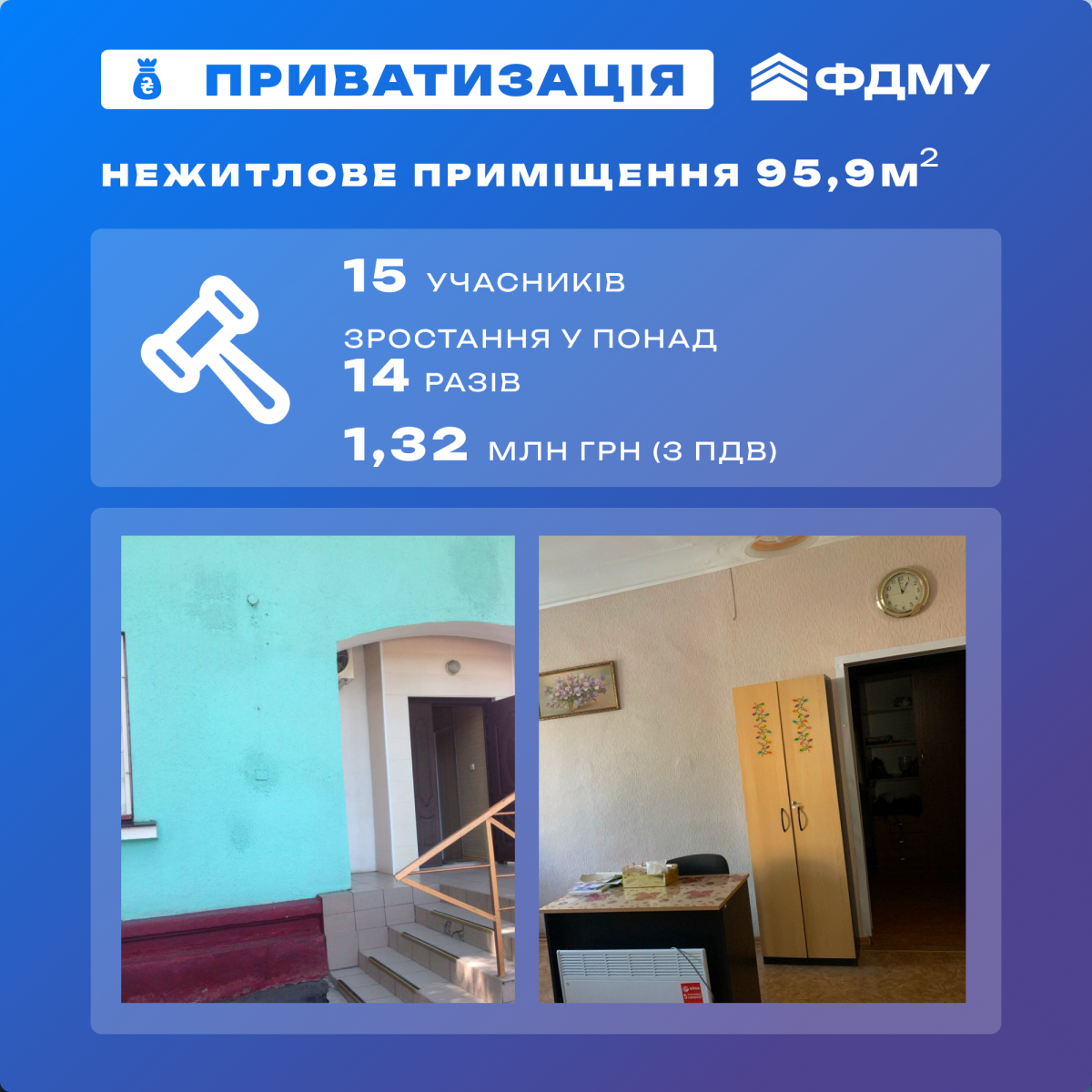 На торгах за цей об’єкт змагалися одразу 15 учасників. Це свідчить про реальний попит на доступні комерційні локації та довіру бізнесу до процедур Фонду. Стартова ціна становила лише 91 тис. грн, але завдяки конкуренції на ринку вартість зросла у понад 14 разів, до 1,32 млн грн (з ПДВ). Один із учасників запропонував найвищу ставку, проте відмовився від оплати, і переможцем став учасник із другою за величиною пропозицією — компанія ТОВ «ВЕКТОР БУД-ТОРГ».