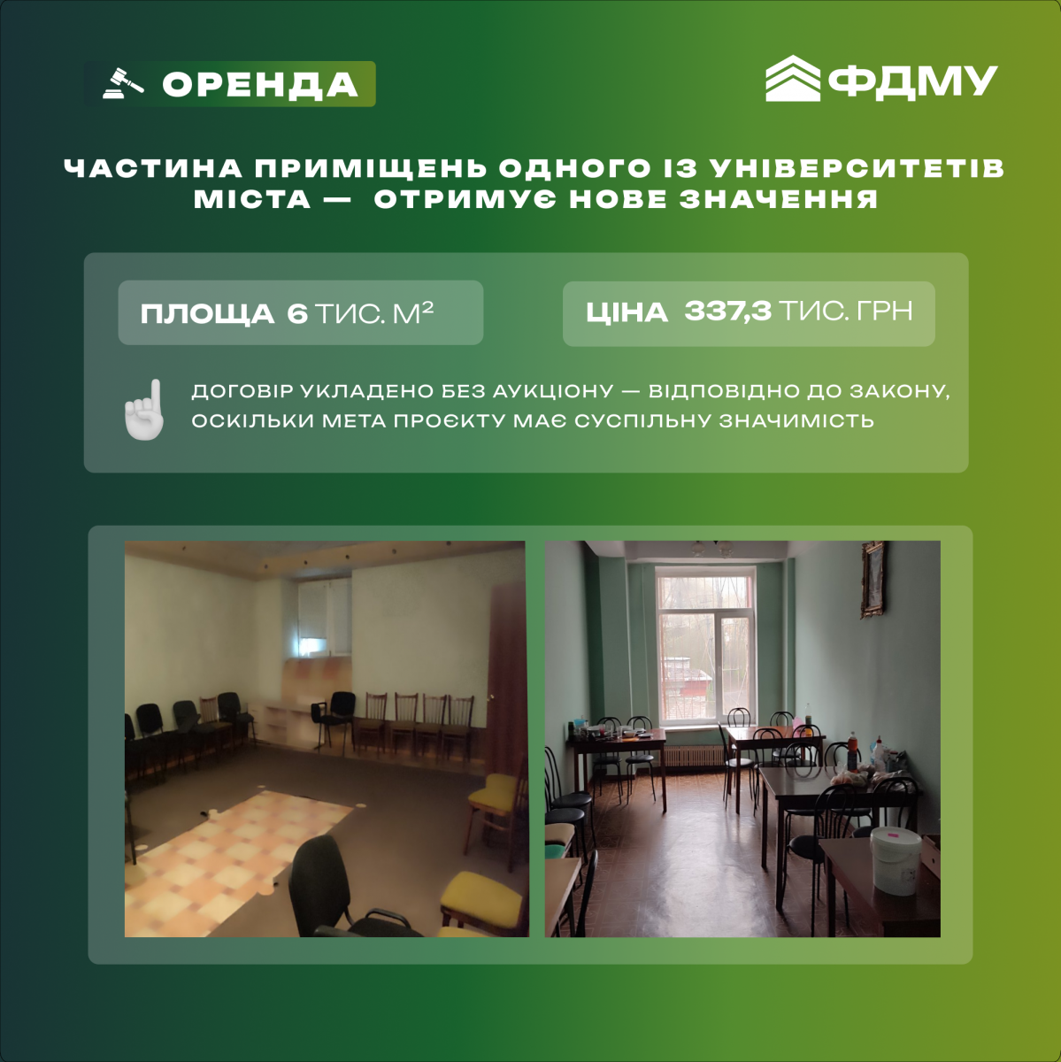 Договір укладено без аукціону — відповідно до закону, оскільки мета проєкту має суспільну значимість, з орендною платою 337 347 грн.
