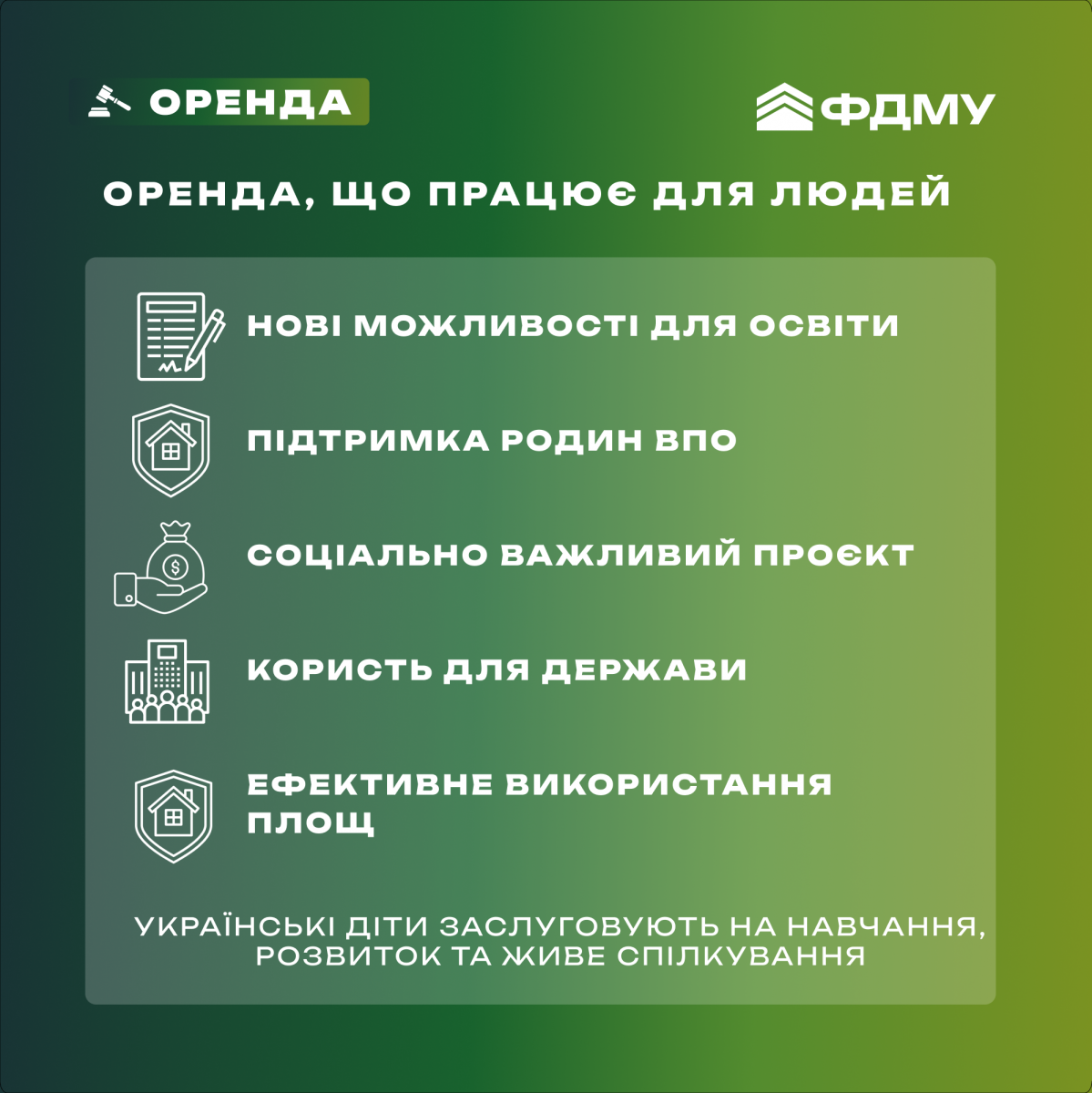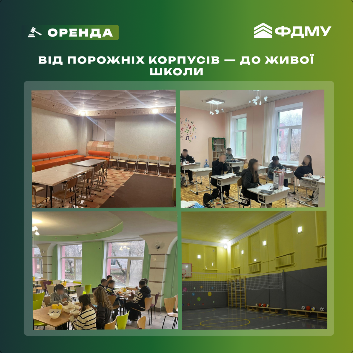 Завдяки оренді державного майна ці діти отримають повноцінну школу: із класами, лабораторіями, технікою, підручниками, спортивною інфраструктурою, харчоблоком та всім необхідним для якісного навчання. Там вони зможуть навчатися, дружити, мріяти й будувати плани на майбутнє, попри війну. Для безпечного навчання у будівлі є укриття, де діти будуть у безпеці під час сигналу повітряної тривоги.