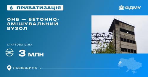 Фонд держмайна оголосив проведення онлайн-аукціону з приватизації об’єкта незавершеного будівництва — бетонно-змішувального вузла на Львівщині. Торги пройдуть в електронній системі “Прозорро.Продажі”.